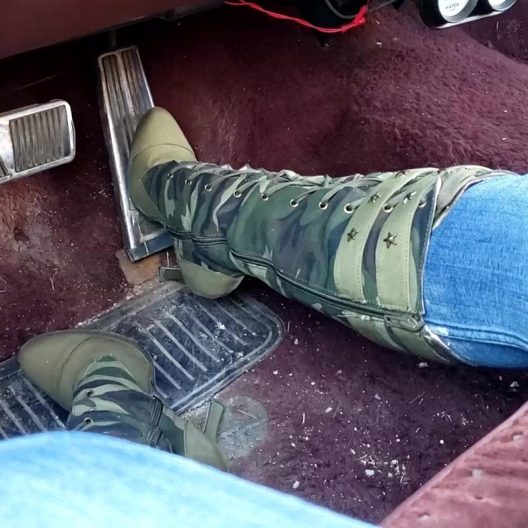 She walks down to the Jeep, gets in and slips on her vintage Dingo black leather boots over her tight jeans with the drives door open. Once booted up, she asks nicely for the keys so she can start the Jeep up and rev it. She tries cranking it up