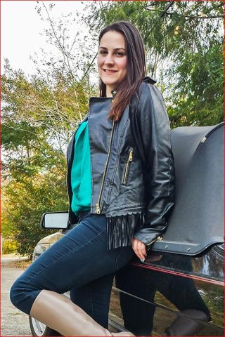 She matches the old Camaro with her red and black leather outfit. I suspect that was intentional and those red boots look good in that old rust-bucket! She gets the old car to start pretty quick and she tries snuffing it out but the car just chugs for a moment