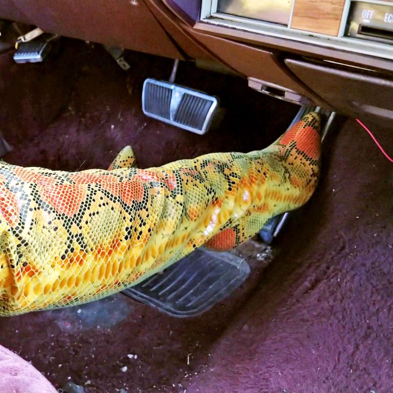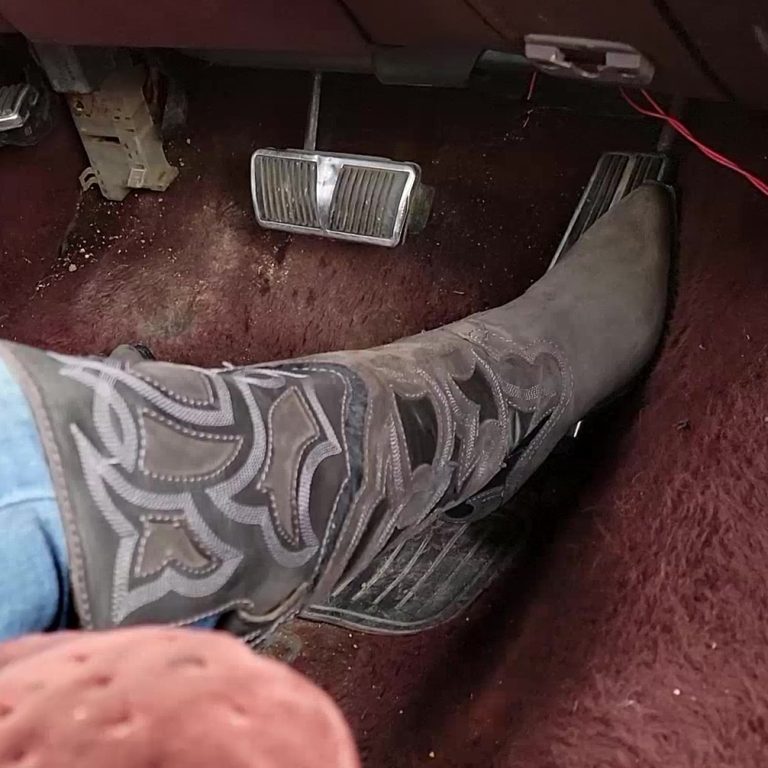 She gives her brown vintage leather boots a quick and frustrated tug to pull them all the way up. She pauses for a moment before trying to start the car again. She’s holding the choke out with her two fingers and firmly pumping the gas pedal while mixing in some