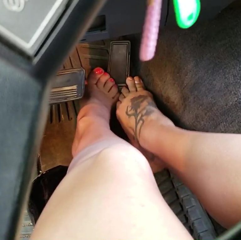 She got the car started and is on her way now! She’s vlogging as she heads there, talking to you while driving. She’s got the camera on the dashboard filming her upper body at first then gets some POV shots of her bare feet working the pedals. She doesn’t get