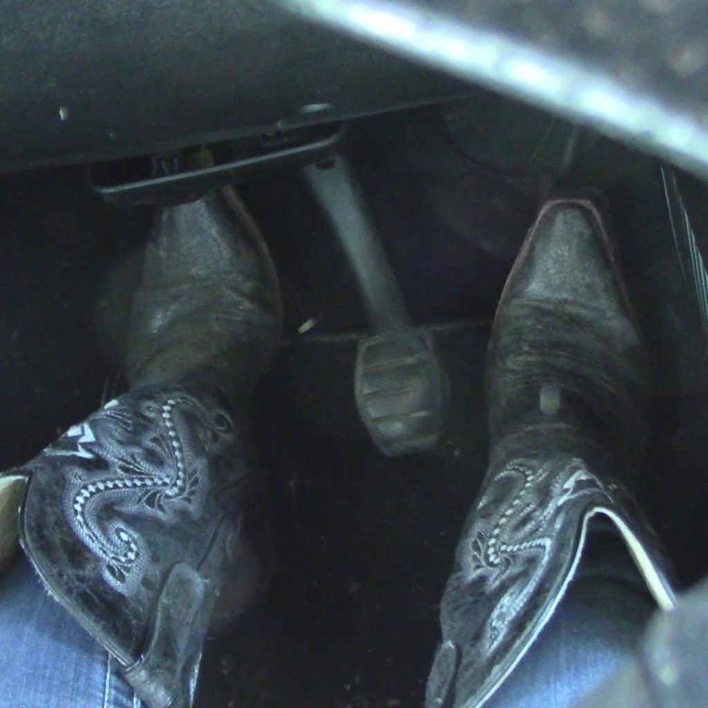 A quick startup before she cruises over to our cars. She’s wearing these gray leather cowgirl boots over her jeans and it’s more a cruise than a hard driving video. It’s a pretty day and she’s just stretching the old Renault’s legs.