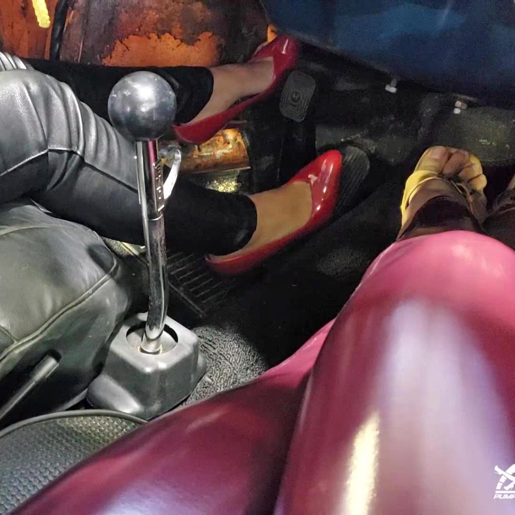 Jane is still driving with her barefeet while Jewels rides along. They’re going to stop and get gas, which should definitely turn some heads since she’s got on her skintight red vinyl leggings and Jewels is wearing her shiny red stilettos with black leather pants.