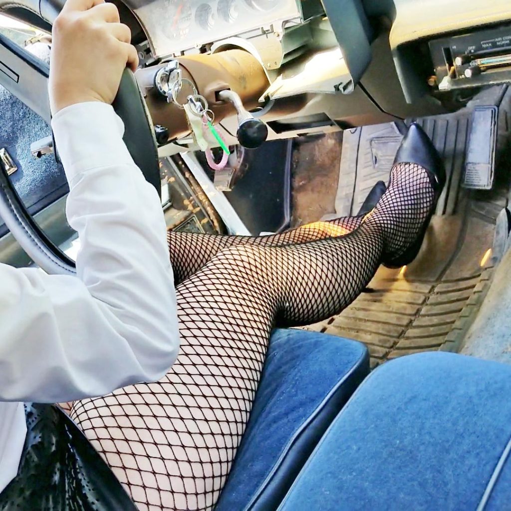 Jane is filming from the passenger side as the video starts with the car already running and Vivian adjusting her seat at the same time the car stalls on her. She jams the gear selector into ‘Park’ and tries starting the car. She stretches her heeled foot out to pump the gas all the way to the floor and hold it sometimes. The car sputters and chugs a couple of times then fires up. She gives it a few good romps and puts it in ‘D’ and leaves the parking lot they filmed the custom at.