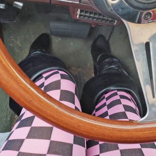 Brooke Cranking Up the 76 Laguna Leather Skirt, Boots & Checkered Stockings