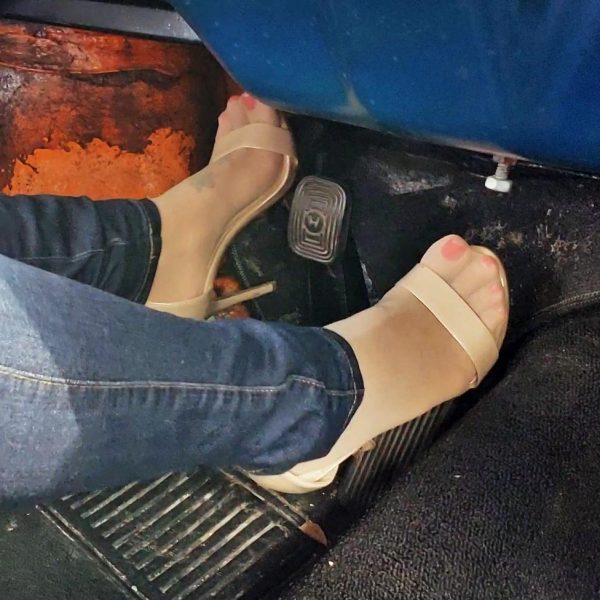Jane Domino Bug Drivin’ in Tight Jeans, Pantyhose & Beige Strappy Stilettos