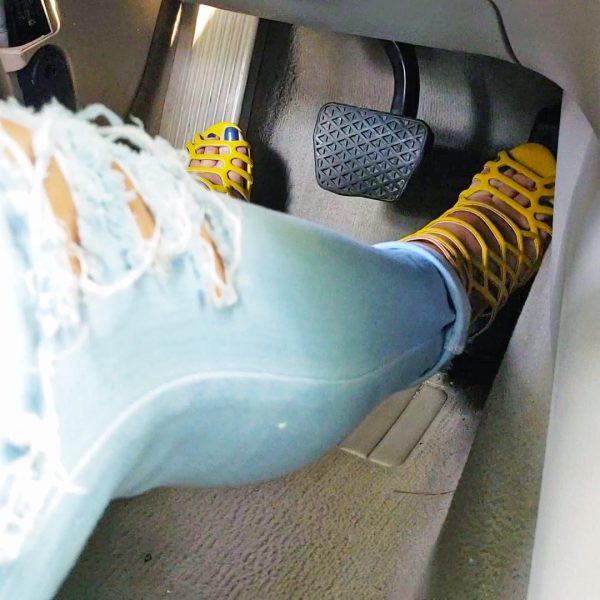 Lynn Revving the BMW in Yellow Strappy Sandals