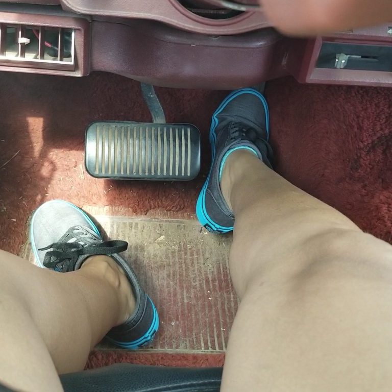 The video starts out with her cranking the Cadillac till it starts and then driving for a bit. The video flips between the floorboard and passenger view. I love that high-slit dress she’s wearing, it really shows off her leg and thigh when her right foot is working the pedals.