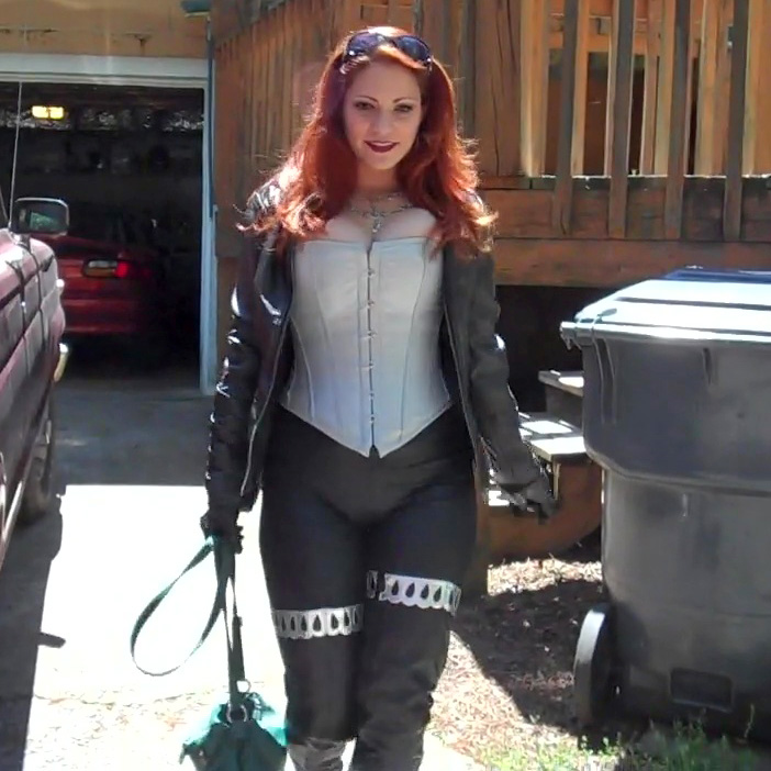 Jane is heading out already dressed up and ready to go. She’s rocking this tight little red dress, brown leather jacket, leather gloves and these gold metal-tipped leopard print stilettos. She gets into the car, gets it started and heads out. She’s not even out of the neighborhood and finds