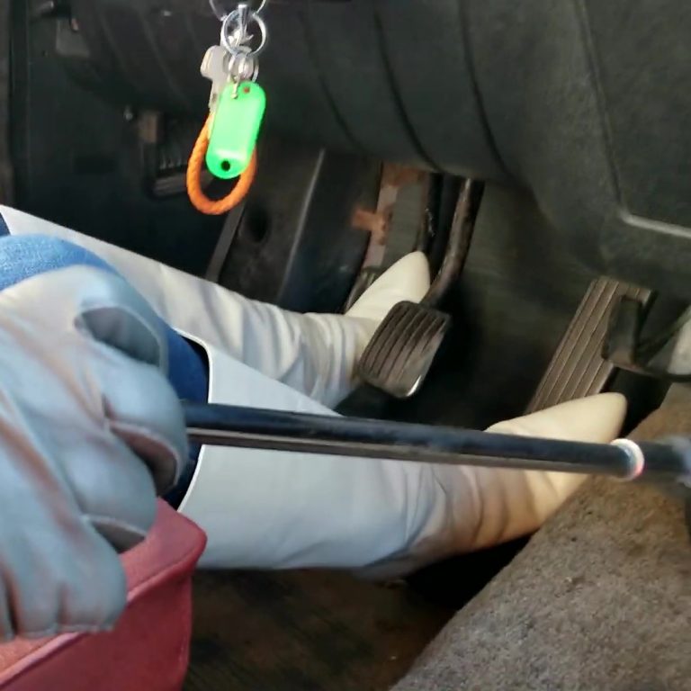 Head to and from the gym with her today in the old Monte. She gets it fired up to leave and with the camera mounted over her left shoulder, we watch her drive to the gym with her bare feet working the pedals. After her workout, the car is a