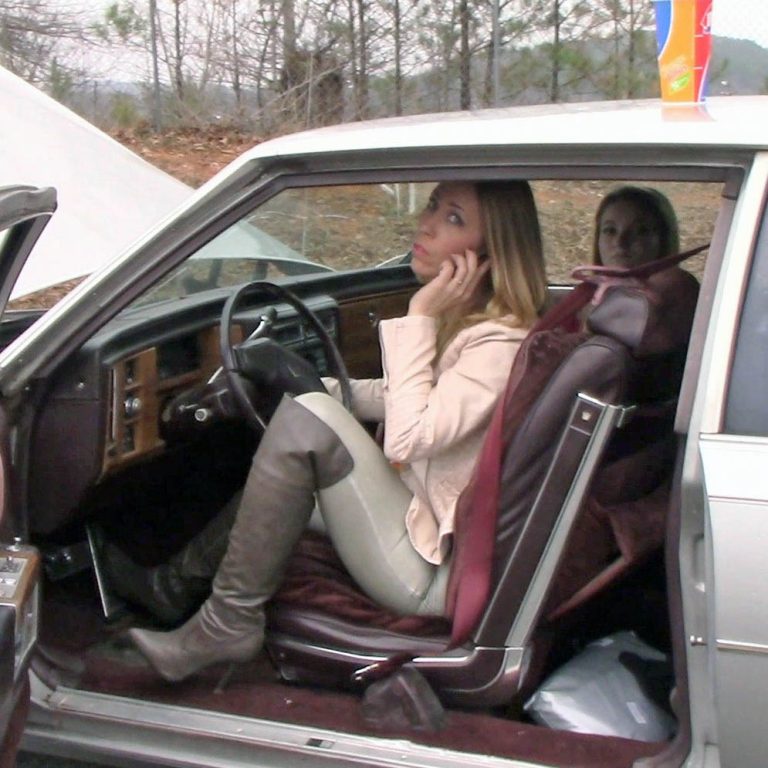 “You ready to go for a ride?” she asks after a slow pan up from her strappy stiletto sandals, sheer pantyhose, miniskirt and button up blouse that she’s wearing. She’s dressed for custom 1352 and has to do a little car tetris before-hand. So she gives the old Camaro a