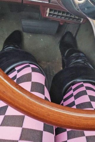 Brooke Cranking Up the 76 Laguna Leather Skirt, Boots & Checkered Stockings