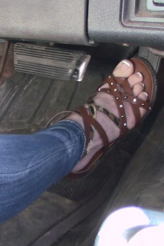 Elizabeth Driving the 87 Renault in Brown Leather Strappy Sandals