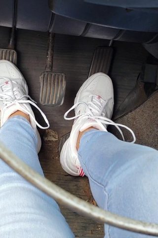 Jane Cranks, Stalls & Revs in the Volvo White New Balance Sneakers