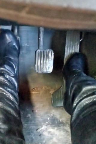 Jane Driving Her Honda Truck Sheer Hose & Brown Pumps