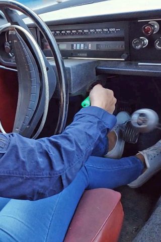 Vivian Ireene Pierce Trying to Start the Cranky Monte in Red Socks, Pumps & Satin Blouse