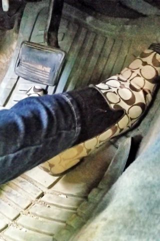 Vivian Broke Down Side of Road Cranking Black Socks Tan Loafers