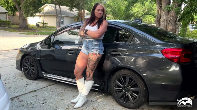 Let’s run to the mart of wall’s to get some stuffs. She’s got a cute little sundress on with a denim jacket and light brown leather cowgirl boots. It’s early in the Fall season and the leaves are just starting to fall. She stretches the legs of the not-so-old Camaro