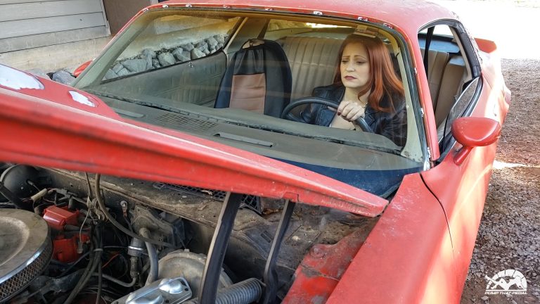 Bored housewife gets dressed up to head out to meet some friends. She’s gonna try to get the Laguna started to take it. She’s got this hot pink outfit on with some gray boots and works that stiff pedal of the old hot rod to try and get it started.