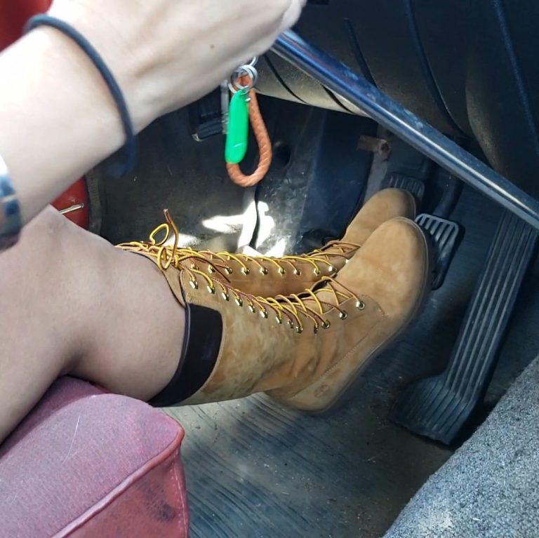 She hops in, gets it fired up and takes the old Volvo for a drive in these knee-high lace-up Timberland hiking boots.