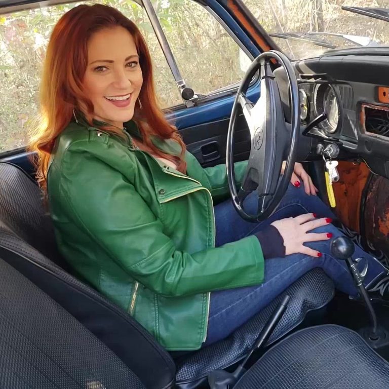 She gets the Bug fired up and does some revving in these vintage high heeled boots, tight jeans and a green leather jacket. A little joking between us in the beginning before she gets to doing some good revving in this old Bug.