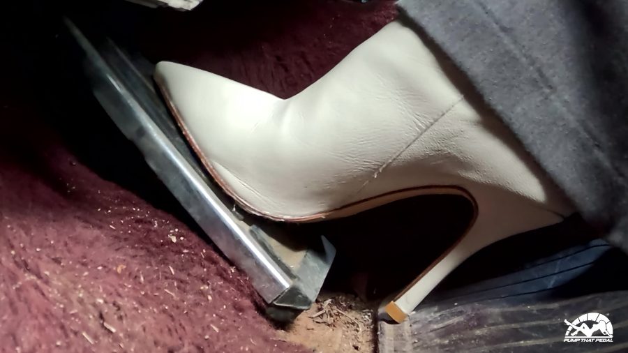 -she has bursts of aggressive pumping with her full leg so the cuff part of the pants around the ankle shake a lot from her firm pumping. Don’t overdo it or anything, just her natural aggressive pumping she gets sometimes when the cars are being really frustrating.
