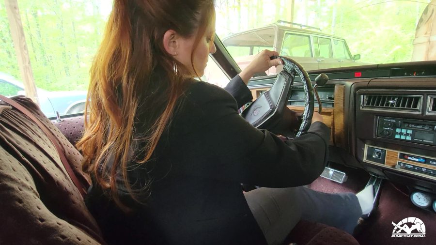 I love seeing Vivian dressed up like a secretary and me being the boss tells her to take my old Cadillac to the shop to get the oil changed. I know she has driven it before and had car trouble in it so I’m hoping it will happen again. The video starts with her walking to the car talking about the task I’m asking her to do. She talks about how it broke down on her last time but that wasn’t her fault. She knows about these old cars and says she had an old Monte Carlo like the one he has in the background.