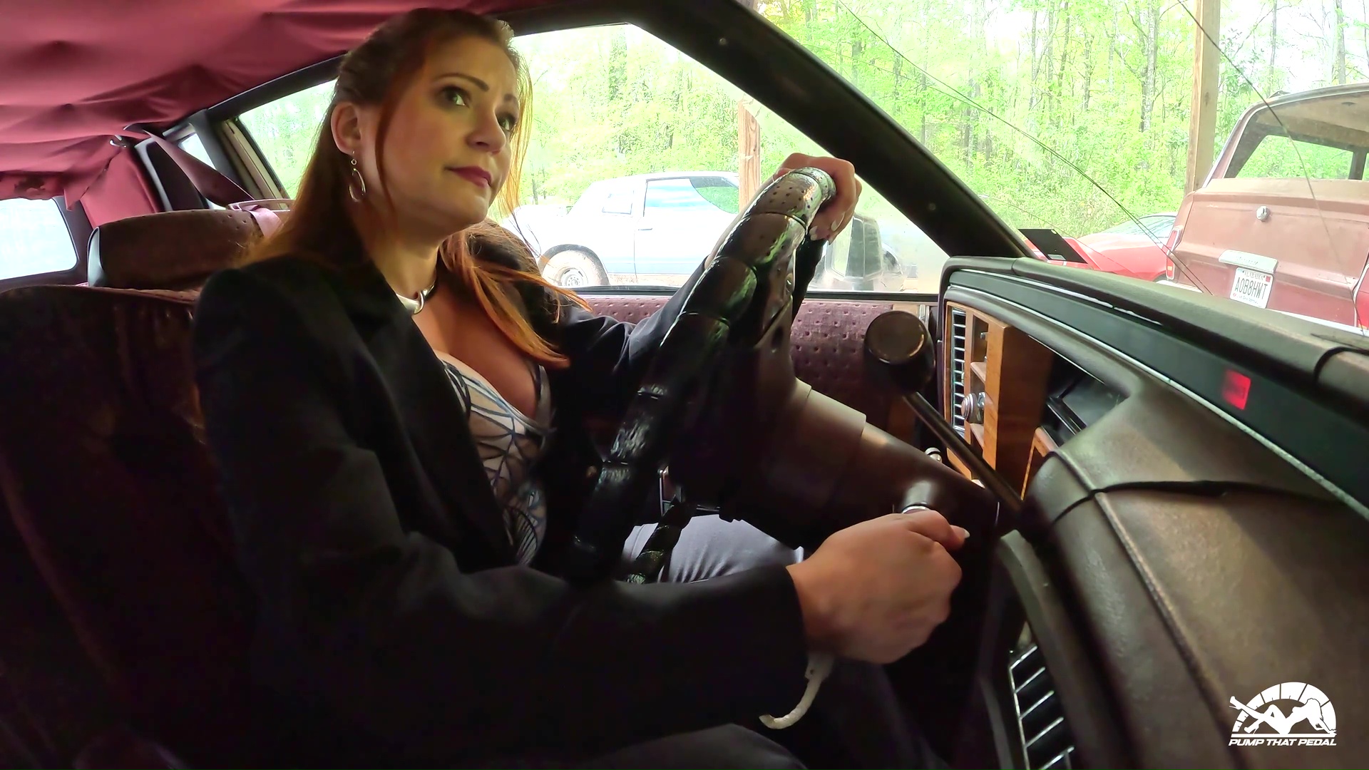 I love seeing Vivian dressed up like a secretary and me being the boss tells her to take my old Cadillac to the shop to get the oil changed. I know she has driven it before and had car trouble in it so I’m hoping it will happen again. The video starts with her walking to the car talking about the task I’m asking her to do. She talks about how it broke down on her last time but that wasn’t her fault. She knows about these old cars and says she had an old Monte Carlo like the one he has in the background.