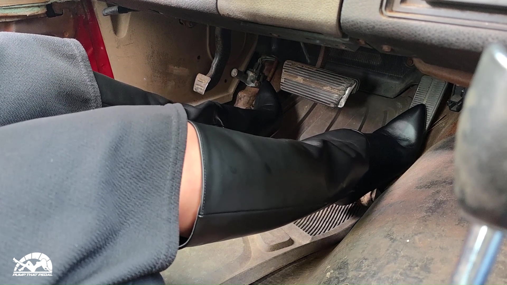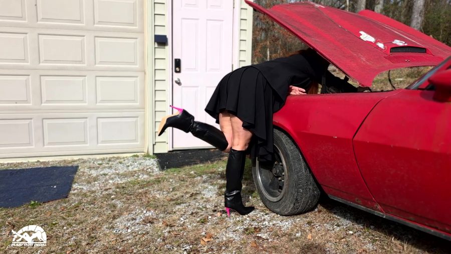 The scene opens with the camera filming Vivian’s right leg. Vivian is already seated in the car. The camera focuses solely on her right leg as she pumps the gas pedal a couple of times. Each time, she presses down and holds for a moment before trying again. Her boot is visible, along with a glimpse of bare skin at its edge. The engine refuses to start, the battery struggling with a weak, fading sound. In the background, her soft whisper breaks the silence: “Let’s go, start”. After a few more tries, the camera pauses.