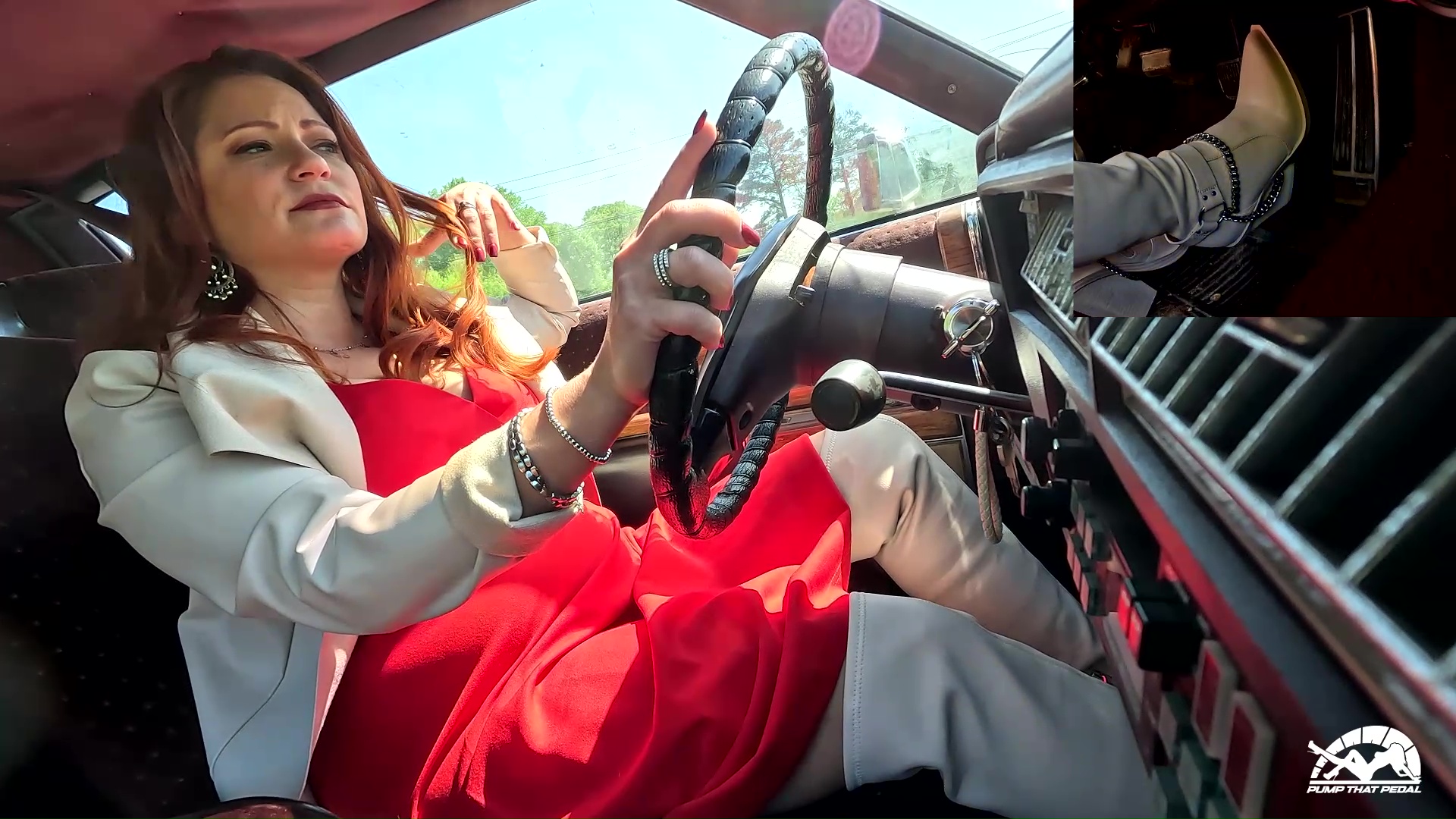 When driving, she can go wherever and is just relaxed and enjoying the feel of the cars power under her boots. She romps on the pedal and holds it to the floor sometimes, she revs it in neutral and some scenes of her left boot propped up on the dash. She’s just a confident woman in her big old gas guzzler!