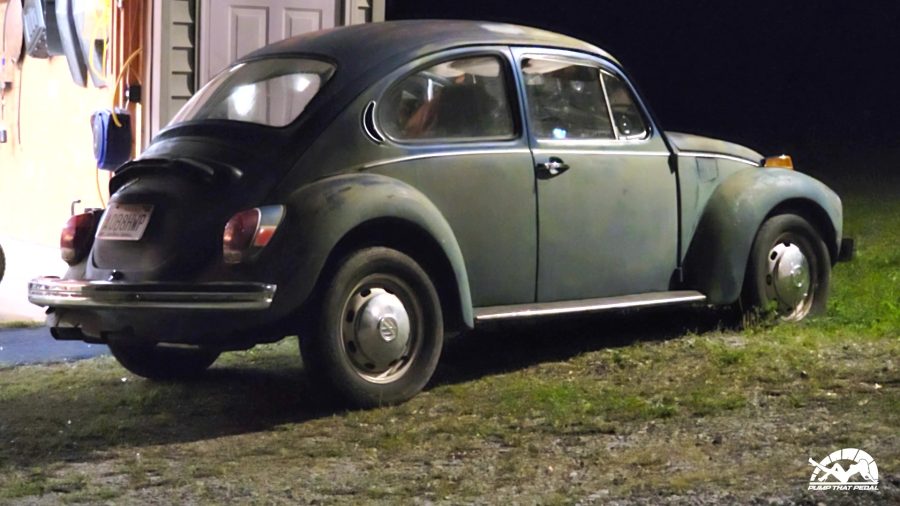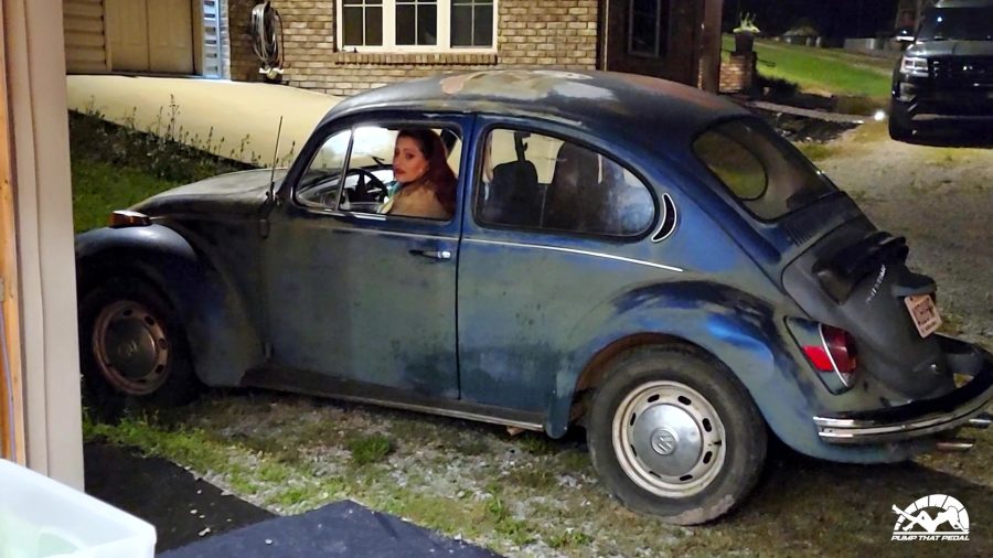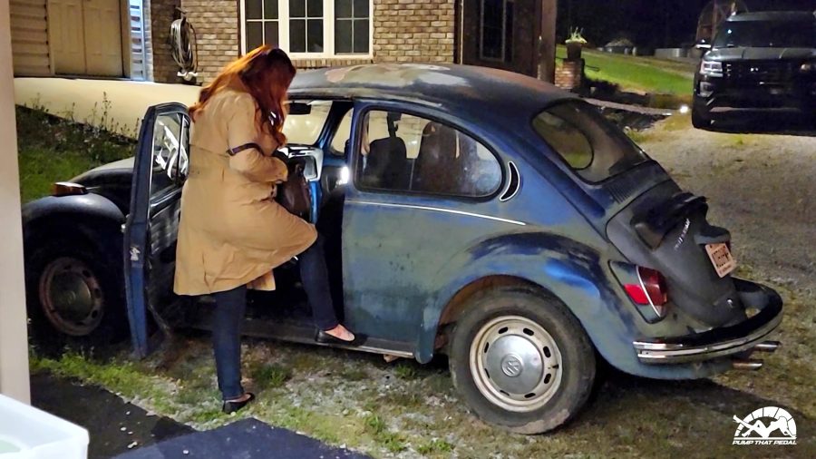 She’s heading out early and will just meet me there. She goes to get in her car and it won’t start. She’s trying to leave but the Bug either won’t start or stay running. After she tries for a while she gives up and parks it.