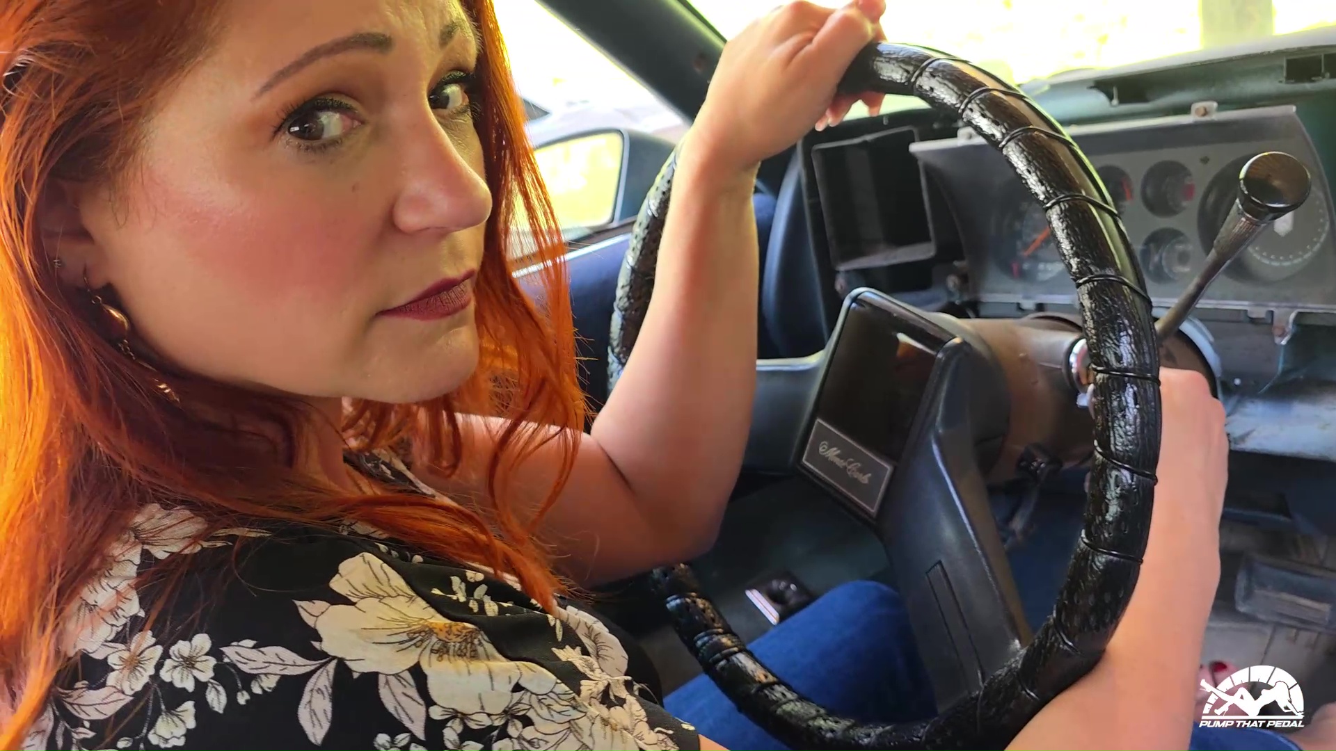 She can say whatever comes to mind as I have no specifics. I just want to see how she gets the old hot engine started up. At the end she can rev it a little before moving the car.