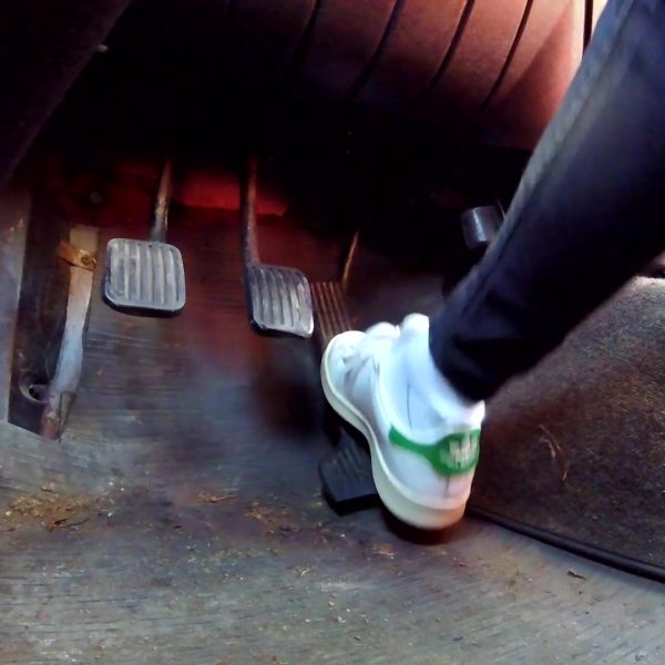 She hops in, gets the Bug started in her red & white hi-top sneakers before…