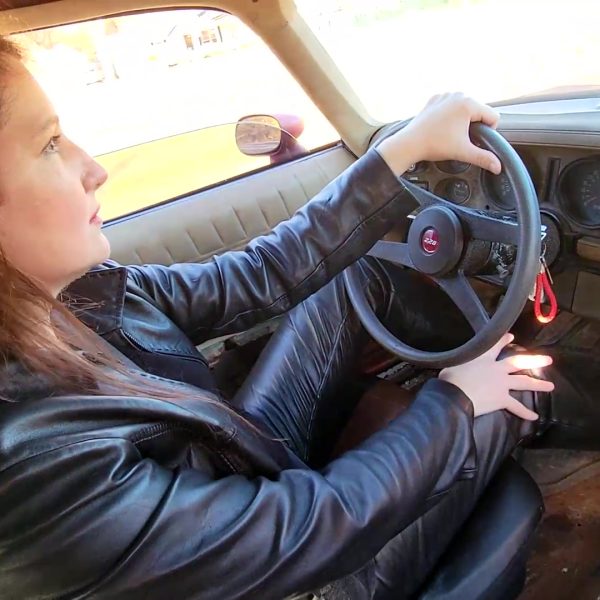 She’s decked in leather and runs her gloved hand across the Camaro’s hood as she…