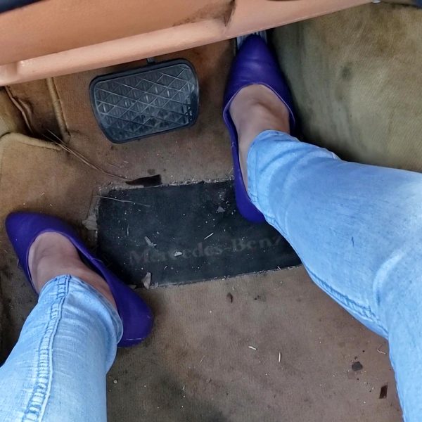 A quick startup before she cruises over to our cars. She’s wearing these gray leather…