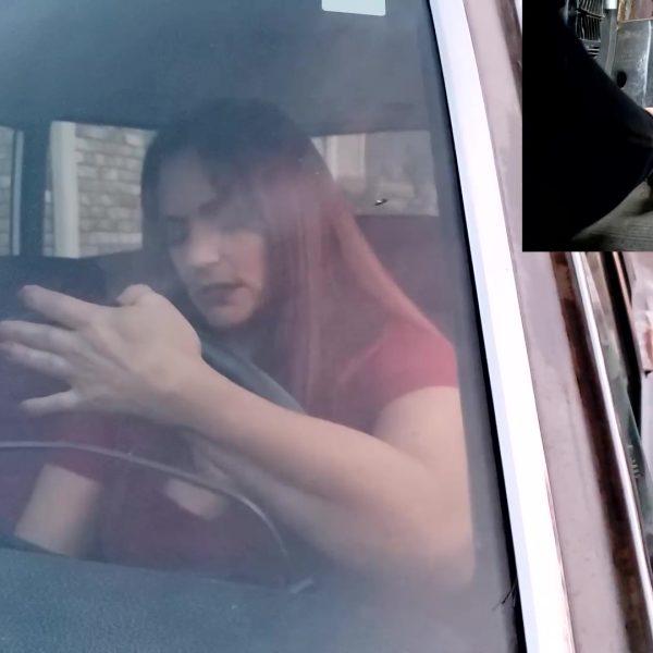 Jewels cranks the stubborn Camaro to get it moved in shiny red stilettos, tight leather…