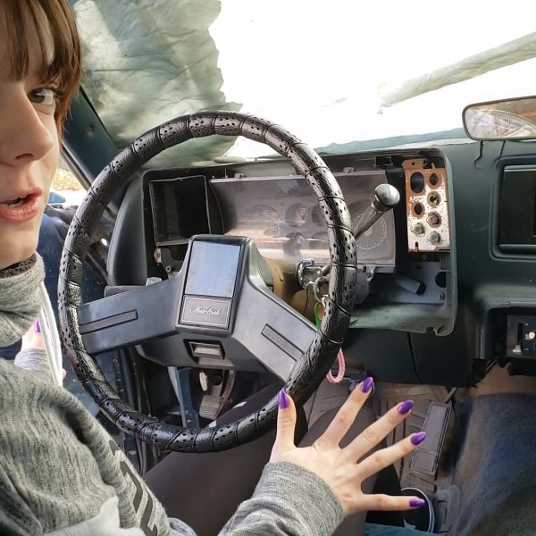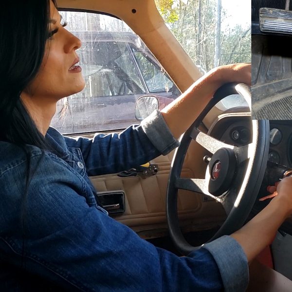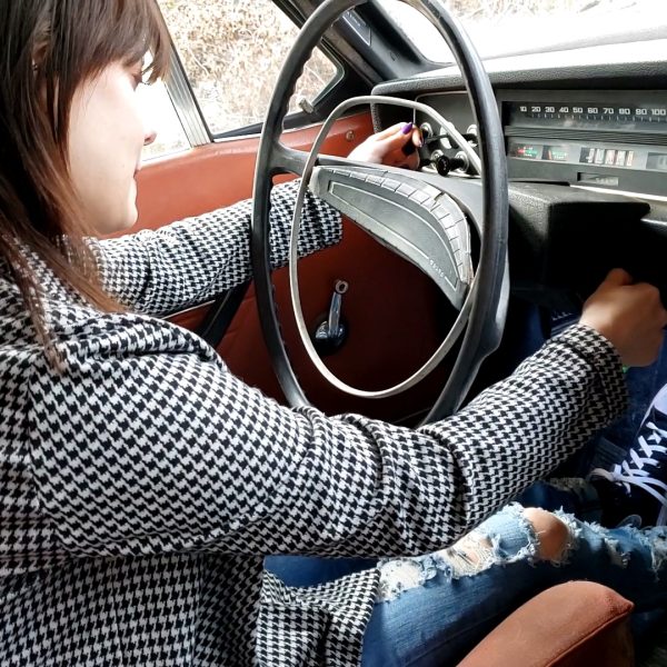 Vivian tries getting the Jeep started first. She’s wearing a multi-colored striped vintage dresse and…