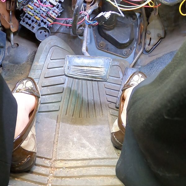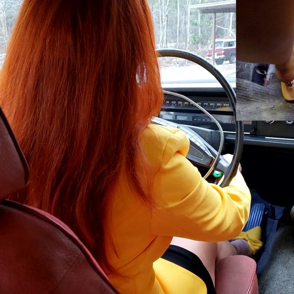 She’s wearing this super short denim skirt with bare legs and no shoes while driving…
