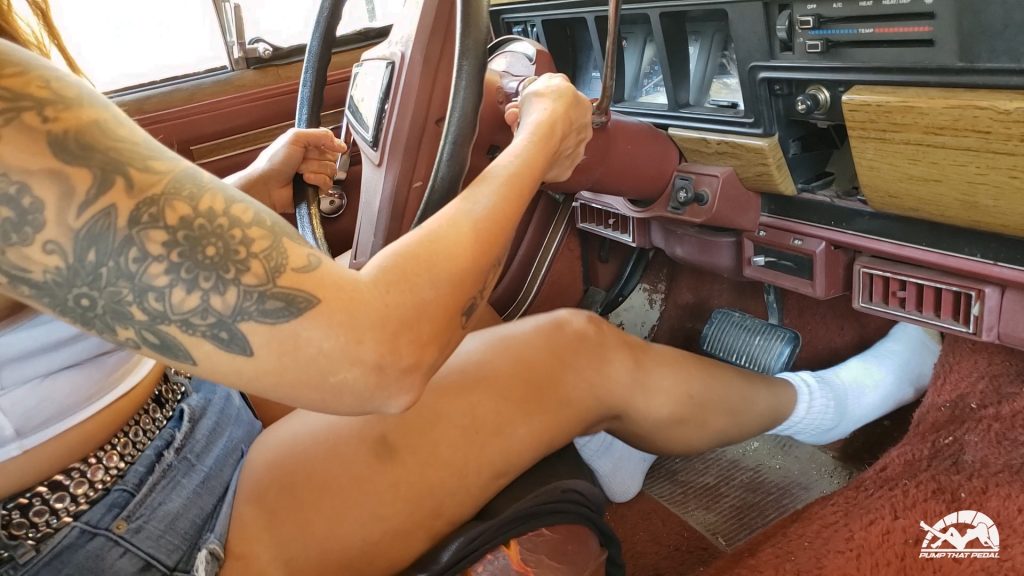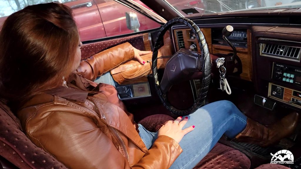 1476 (Pedals) – Vivian Ireene Pierce Leather Riding Babe Mounts the Caddy
