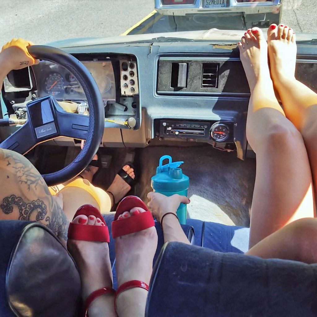 Shish is shooting a video with Jewels in the Coronet while Brooke Jane and now Vivian getting in and sitting next to Jane in the front passenger seat. Jane is wearing a green tank top, denim shorts, barefoot, she puts on black leather strap stiletto sandals when she drives the Monte-Carlo following Jewels behind the Coronet, thatโs a few minutes into the video. Brooke is wearing a black v-neck tank top, denim shorts, barefoot . Vivian is wearing a red tank top, denim shorts, brown cowgirl boots barefoot, red leather strap stiletto sandals.