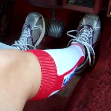 Heading out to look for some places to film future customs in the old Jeep with Cassandra. She’s wearing some tall socks with sneakers at first. She drives with her left foot doing the braking while her right foot stays on the gas. We’re heading to the house to get her boots since we forgot them. She changes out of her sneakers and into the boots before we head out again.