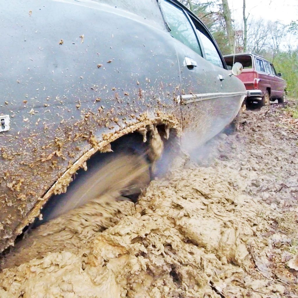 Scarlet comes to assist at the end of the video. The Jeep is chained to the Coronet and filming from outside the passenger side rear quarter panel, you get to see that tire that is just covered in thick mud slowly get snatched out of the hole.