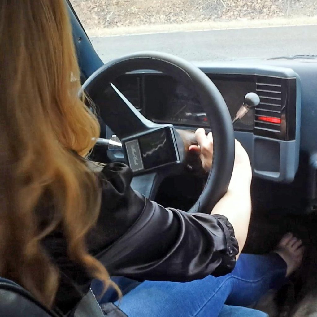 Cassandra is wearing a pair of leather strap wooden sandals at first but kicks them off later to crank and drive barefoot. She lays into the gas pretty hard considering the road conditions and you can hear the engine opening up all barrels to meet her requested demands. However, her aggressive stopping does put a strain on the carb and it stalls out almost every time. It loads up with fuel and is a bitch to get started, especially one time where she spends a couple of minutes cranking the car at a stop sign.