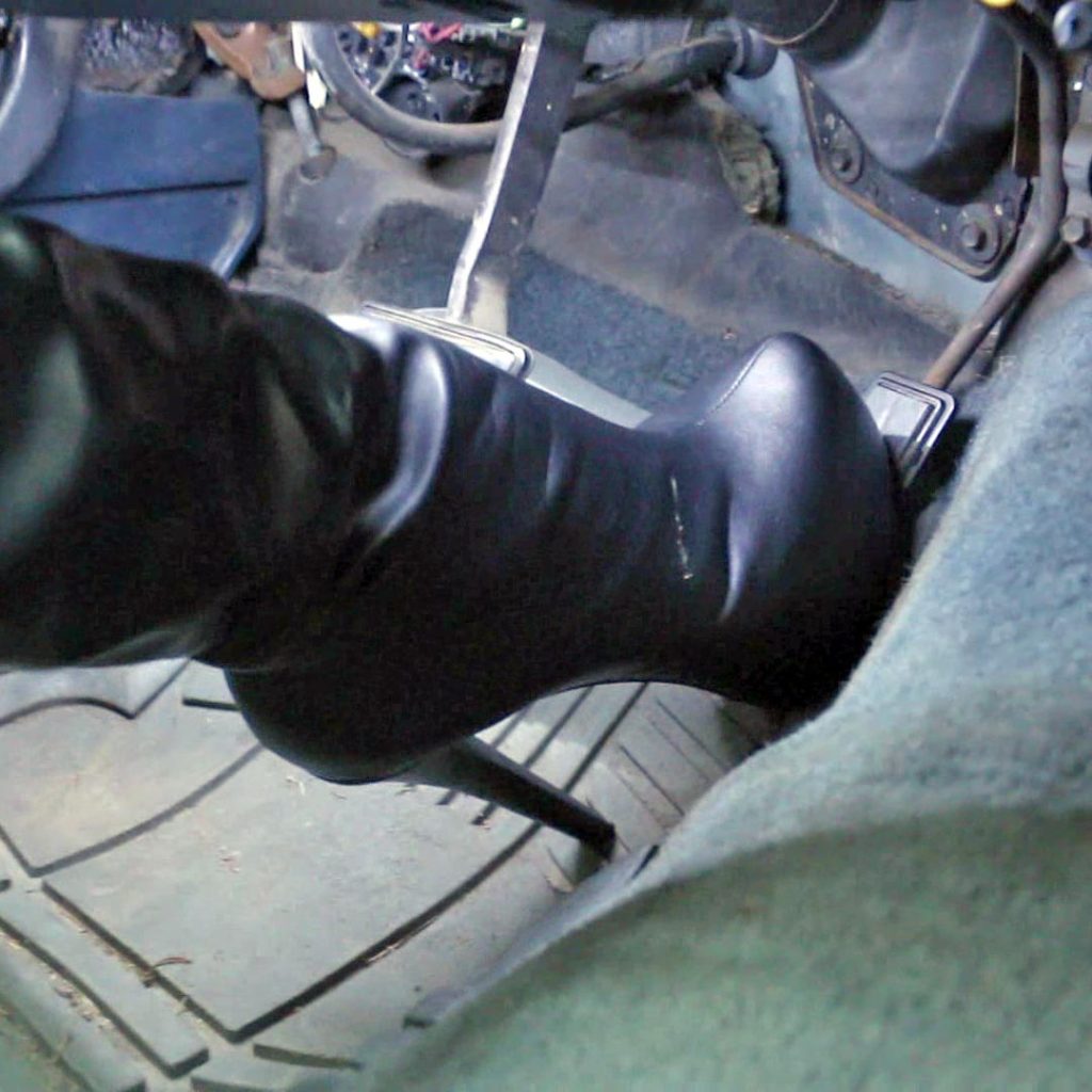 Shish is shooting a mixture of whole body video as Diana walks out to the Monte-Carlo from the wooden deck of the house to the car, and upper and footwell video as she cranks and pumps the Monte-Carlo’s gas pedal. The way she’s pumping the gas pedal it doesn’t look like she’s trying to hard to get it to start, as Diana rubs different parts of her body from up around her chest and down to her legs in her dark black leather OTK leather stiletto boots.
