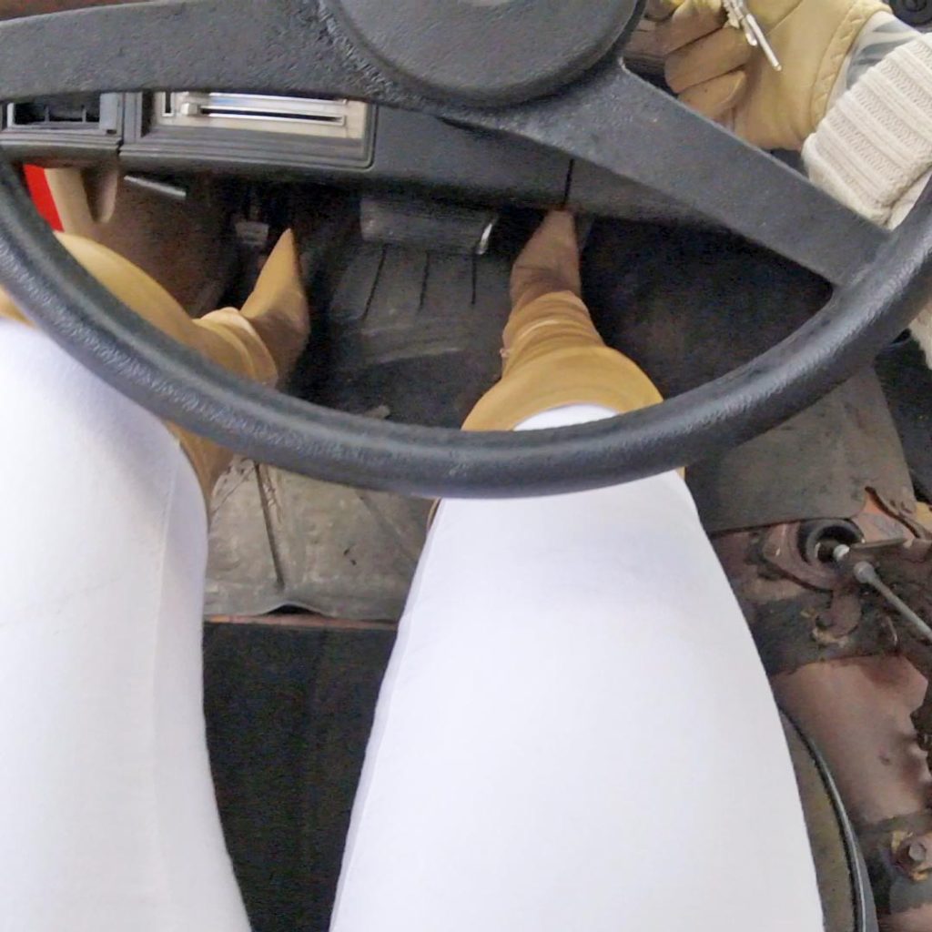 Dirty Diana climbs into the old Camaro with her tight white jeans and tan leather over-the-knee boots to get it fired up. Filmed from her POV the whole time, she slides the key in with her matching tan leather driving gloves and twists the ignition to spin the engine over. Her pointy-toe stiletto boots pump on the gas and she keeps at it until it fires up. When it catches and starts, she immediately mashes the gas to the floor to rev it hard. Thinking it’s ready to be moved, she puts it in gear and it stalls out.