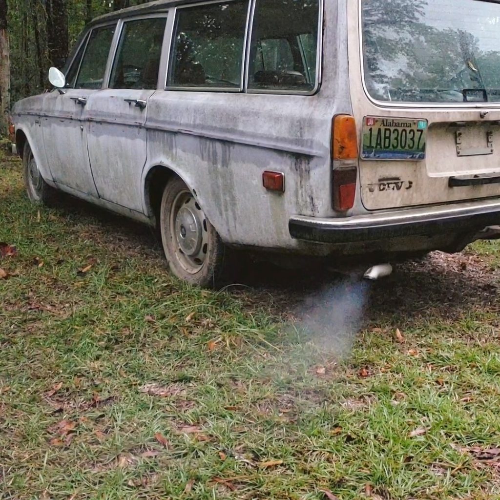 Getting the old Volvo fired up in some red shiny boots, red leather gloves, torn leggings and a denim jacket. The car sputters, chugs, kicks, bucks and spits smoke from it’s tailpipe while she tries to wrangle control of it.