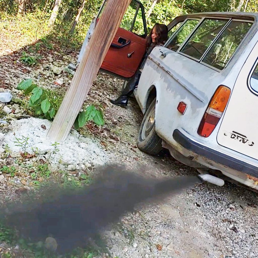 Filmed from the drivers open door at first and then from the back of the car viewing the exhaust a she romps on that old and worn-the-hell-out gas pedal black leather riding boots. The Volvo is spitting out black some black smoke each time it pops and misfires but she just smiles and keeps revving.