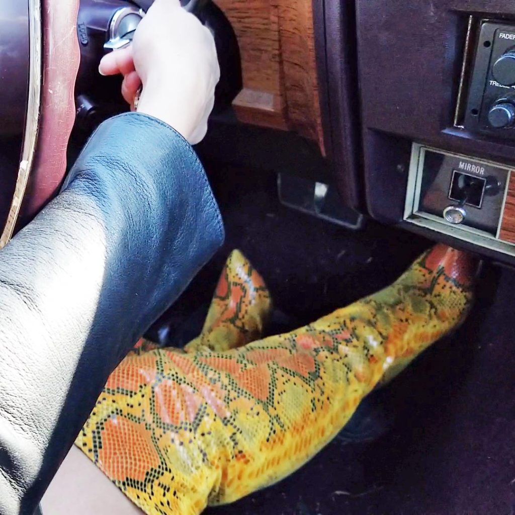 Jane’s sexy right foot must be a swamp from at the pumping of the gas pedal she did, after a few false starts she gets the engine started she backs the Cadillac up to the garage, she does a little bit of revving. Shish shoots whole body video as she walks up to the Cadillac and upper and footwell video of Jane’s sexy size 6.5 feet in her yellow snake skin boots, and upper and footwell video as she talks flirty to you while she gives the gas pedal a pretty good romping. Jane opens the drivers door leaning out looking at the exhaust as she shows off that sexy rear of hers in that black leather mini skirt.