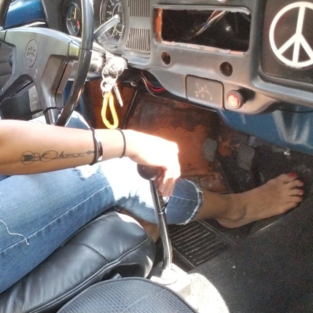 She gets in, fumbles for the key, inserts it into the ignition and twists. The engine cranks over and she quickly gives the gas pedal some pumps and the car sputters to life. She’s wearing her sandals at first but kicks them off after some a few hard romps. She then gives it a few more hard romps with her bare feet and then takes off for a drive.