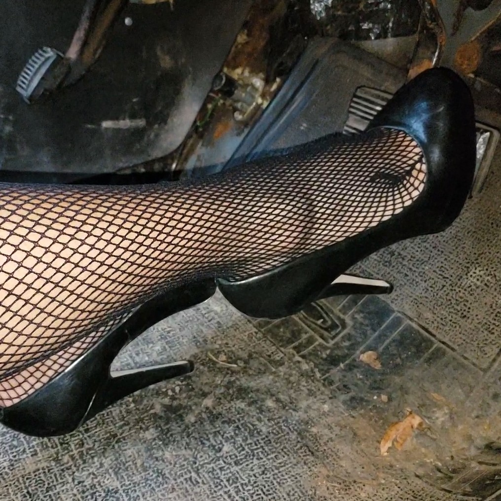 Sitting in the car already she gives the car a hot start since it had already been started for the day and we just finished filming custom #1073. So this was after that scene with the car having a little bit of time to take a breather. It takes some tries to get it going and that battery starts getting weak pretty quickly. It fires up before it dies and she lightly revs at first. She being a bit of a tease too with this itty bitty mini skirt on and those thigh high fishnets. Those platform stilettos give the gas a few quick romps before she puts it in gear to move it the 20ft to park it. She gives it some more romps before turning the engine off.