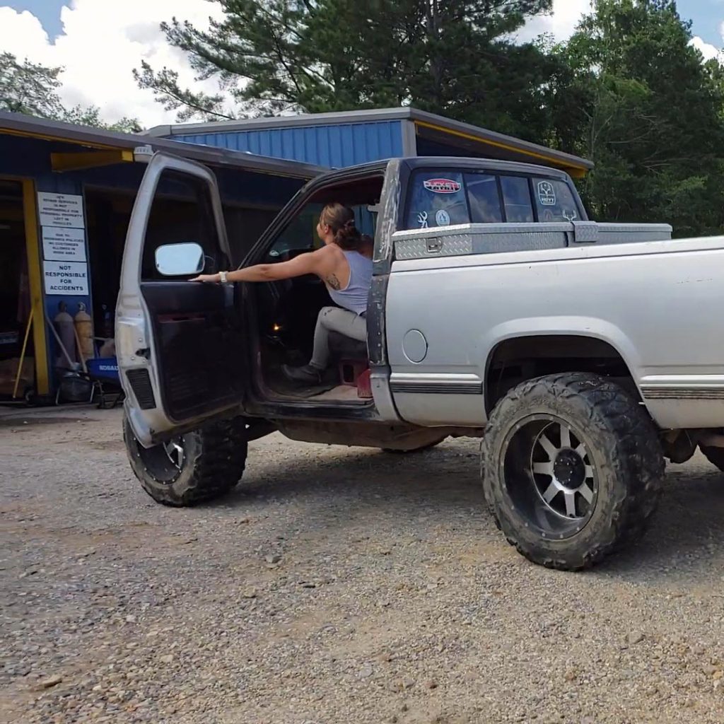 Shish also points the camera at the windshield showing the highway as she drives down to the shop. Jane parks the Monte-Carlo with the shop dog walking around them. The shop mechanics need a little help getting an old Chevy truck part way into the garage so Jane gets in steering the truck while the mechanics push it in the garage.